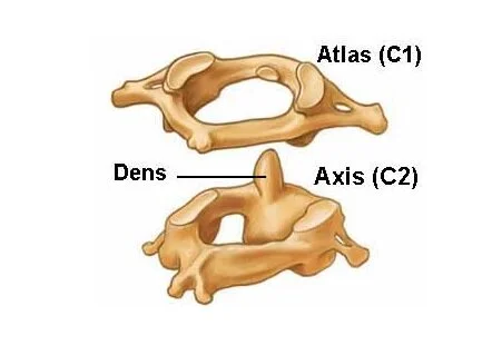 Axis is the second cervical vertebrae (C2). It is easily identifiable due to its dens (odontoid process) which extends superiorly from the anterior portion of the vertebra. The dens articulates with the anterior arch of the atlas, creating the medial atlanto-axial joint which allows for rotation of the head independently of the torso. The axis also contains superior articular facets, which articulate with the inferior articular facets of the atlas to form the two lateral atlanto-axial joints.